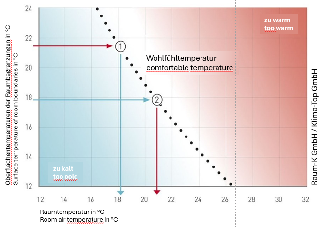 ➁ Bei Hüllflächen-Temperaturen von 18 °C benötigt man für die gleiche thermische Behaglichkeit eine Lufttemperatur von ca. 21 °C.