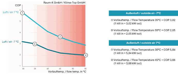 This multiplies the energy used. It achieves the highest efficiency when it only needs to slightly raise or lower the flow temperature. In heating mode, a low flow temperature significantly increases energy efficiency.