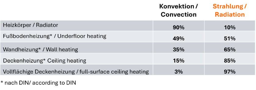 A significant role is played by the chill effect. This refers to the air movement in the room caused by a convection heater. The cause is the room air temperature and the surface temperatures of walls, floors, and ceilings. With radiators and underfloor heating, the air temperature is up to 5° higher than the surface temperature of the surrounding room envelope. This creates air currents in the room, which essentially produce the cooling effect of a fan, known as the chill effect. This chill effect means that the room air temperature with underfloor heating must be about 4 Kelvin higher than with a fully activated climate ceiling (source: ... with link).